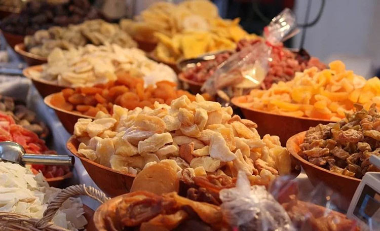 將果塊撈出,瀝干糖液,擺放在烘盤(pán)上,送入烘干室,在60~66℃的溫度下干燥至不粘手為度,大約需要24h。
